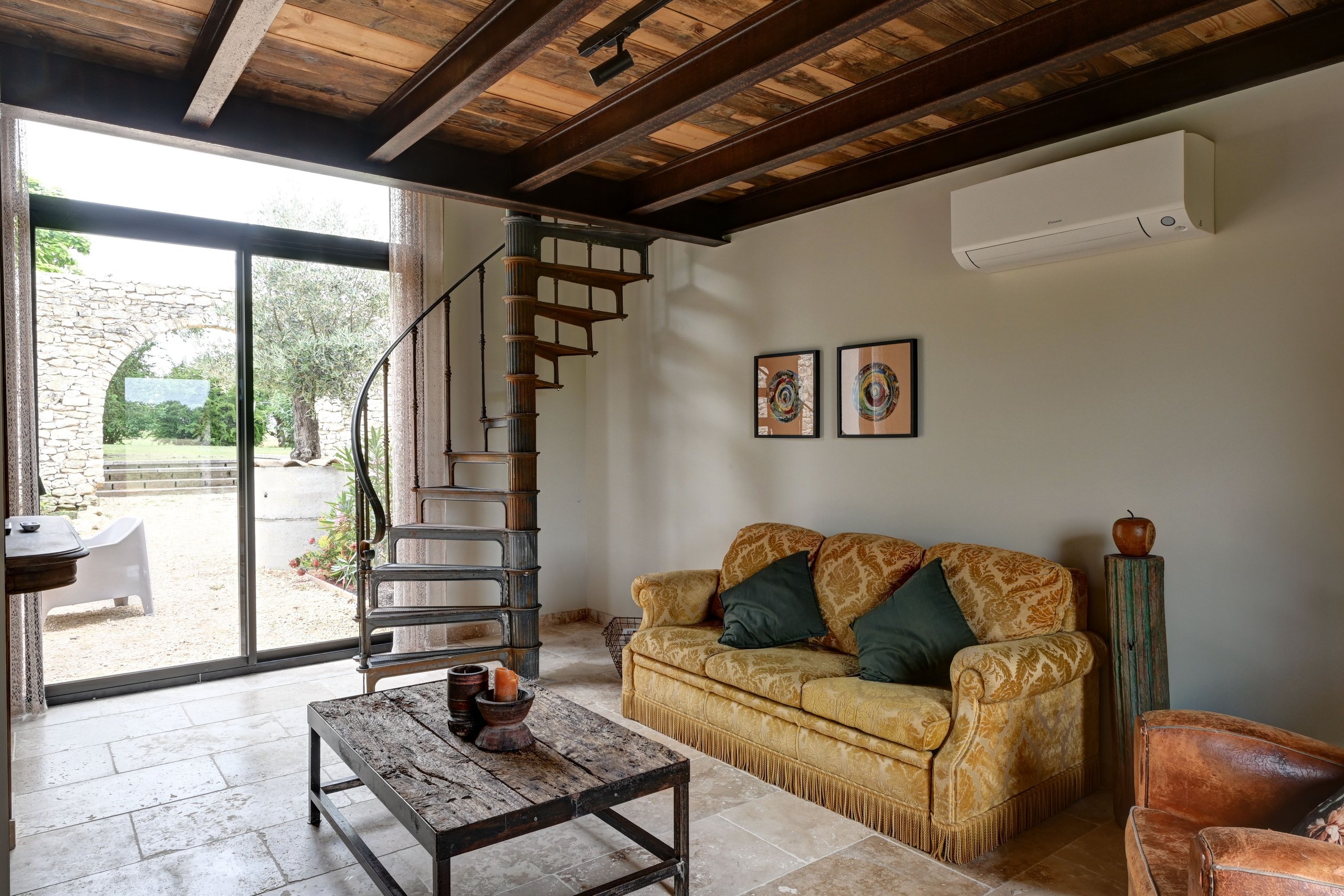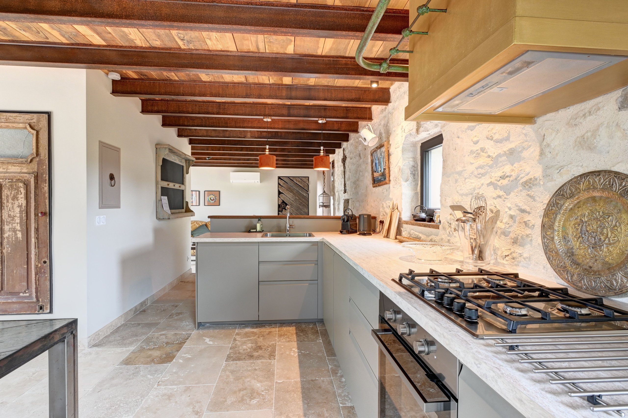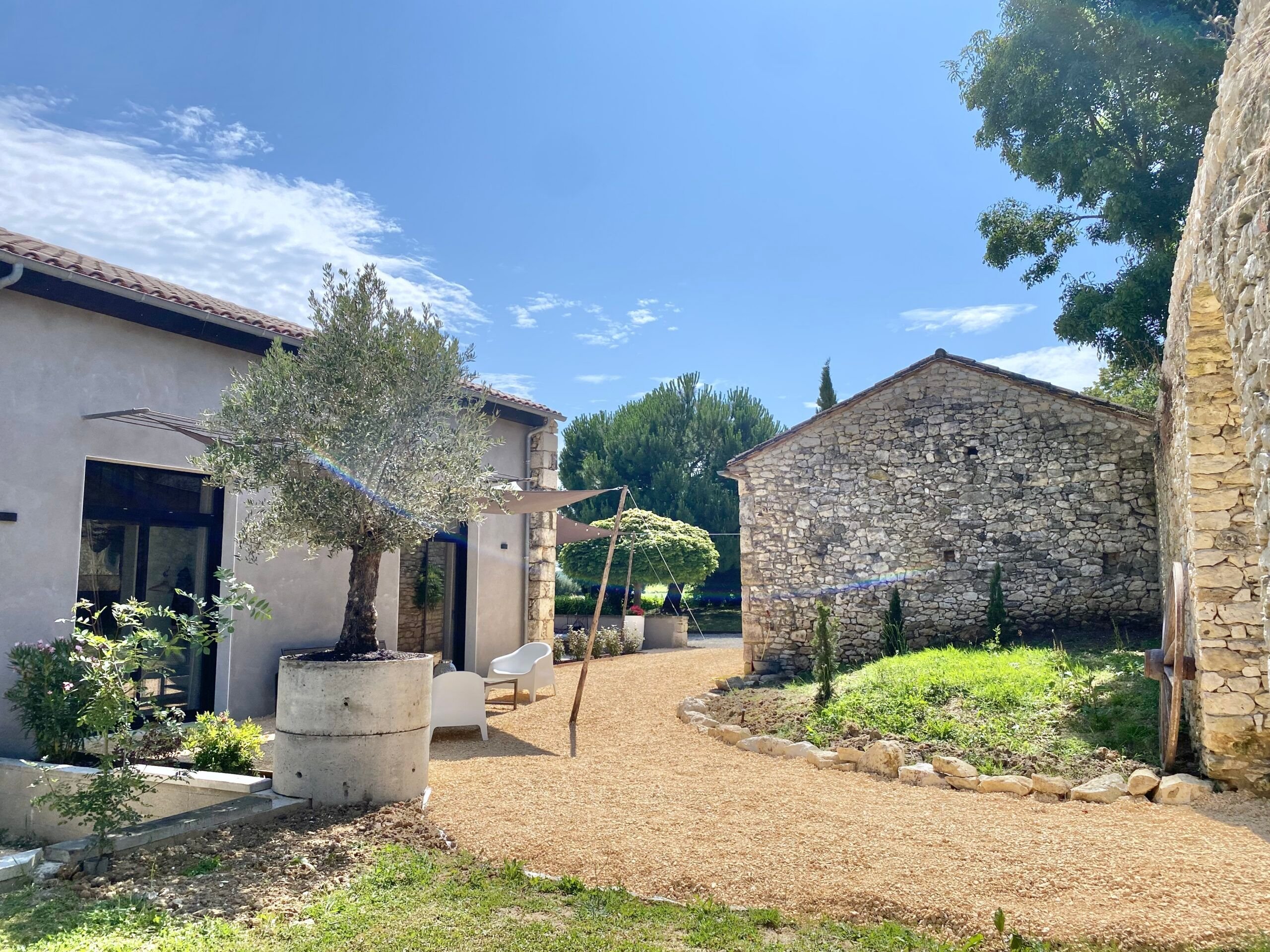 De tweede gîte bevindt zich in de oude schuur en is onlangs opgeleverd. Vooraan ligt een prachtig terras, met een aangename en smaakvol ingerichte woonkeuken. Een lichte woonkamer met openslaande deuren en op de bovenverdieping, via een wenteltrap, twee slaapkamers en een badkamer. Omkeerbare airconditioning.