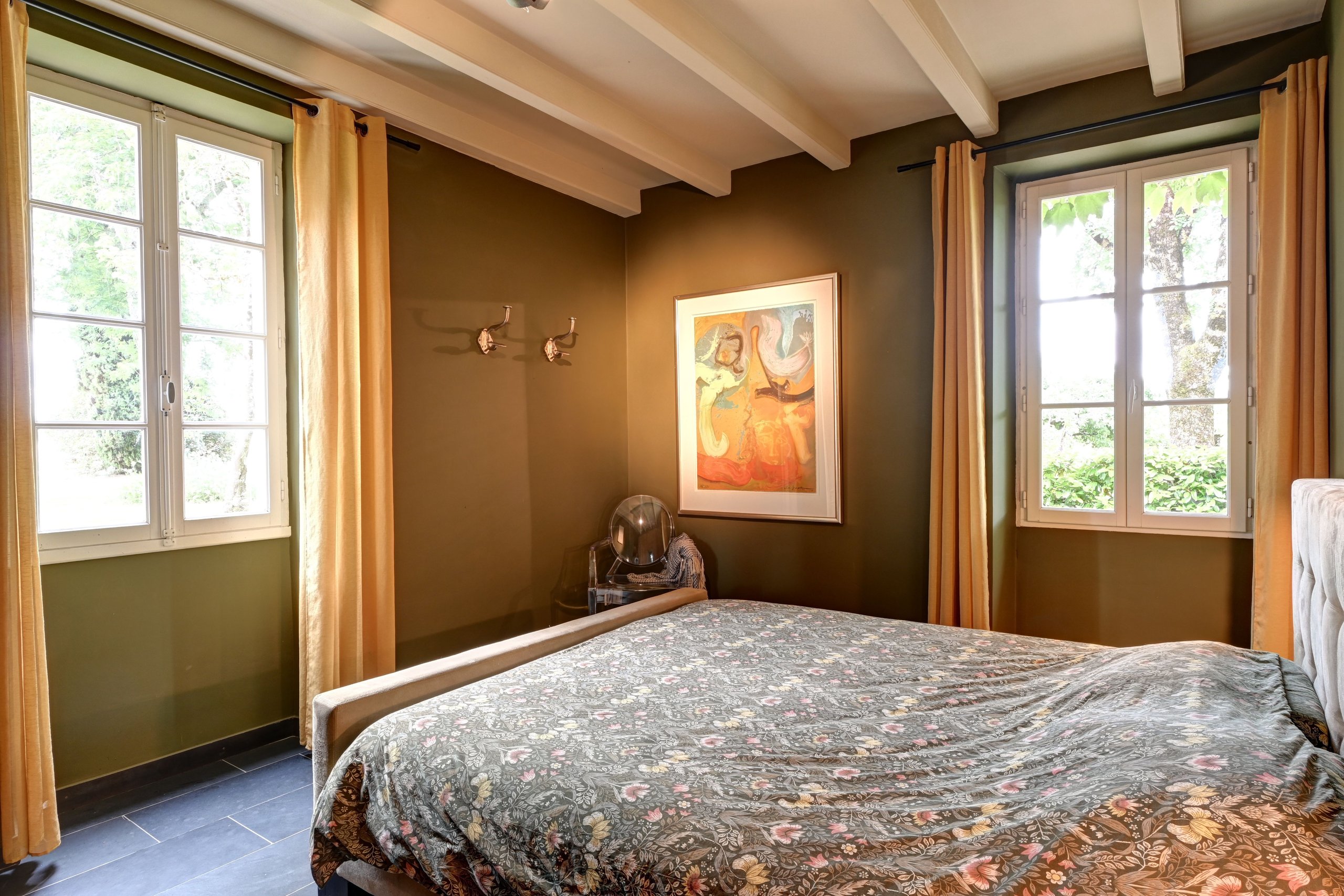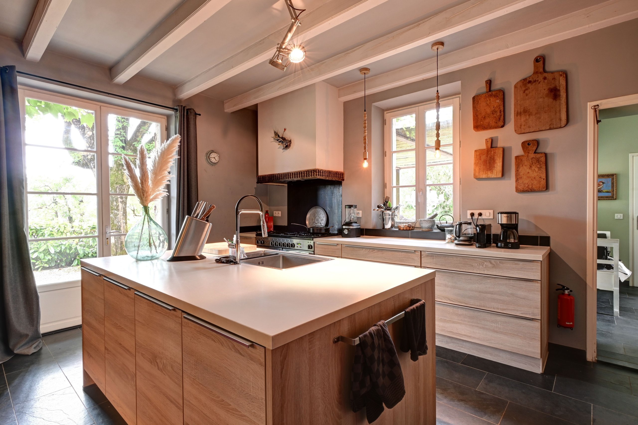 In een rustige, groene omgeving gaan de gebouwen over in een volgroeide landschapstuin en de schaduw van hoge bomen. Het huis is volledig gerestaureerd met hoogwaardige materialen en heeft een moderne en elegante uitstraling. Het bestaat uit een mooie hal met een gastentoilet en een ingerichte wasruimte. Vervolgens komt u in de keuken/eetkamer, die uitkomt op een prachtig terras. De keuken is modern en van alle gemakken voorzien, en de eetkamer is voorzien van een houtkachel en een stenen vloer. Vloerverwarming is aanwezig op de begane grond. Aansluitend bevindt zich de woonkamer met een open haard, prachtige openingen en een volledig open plafond. Ook een werkplaats/kantoor bevindt zich op de begane grond, evenals de master suite met een inbouwkast en een ruime, moderne badkamer.
