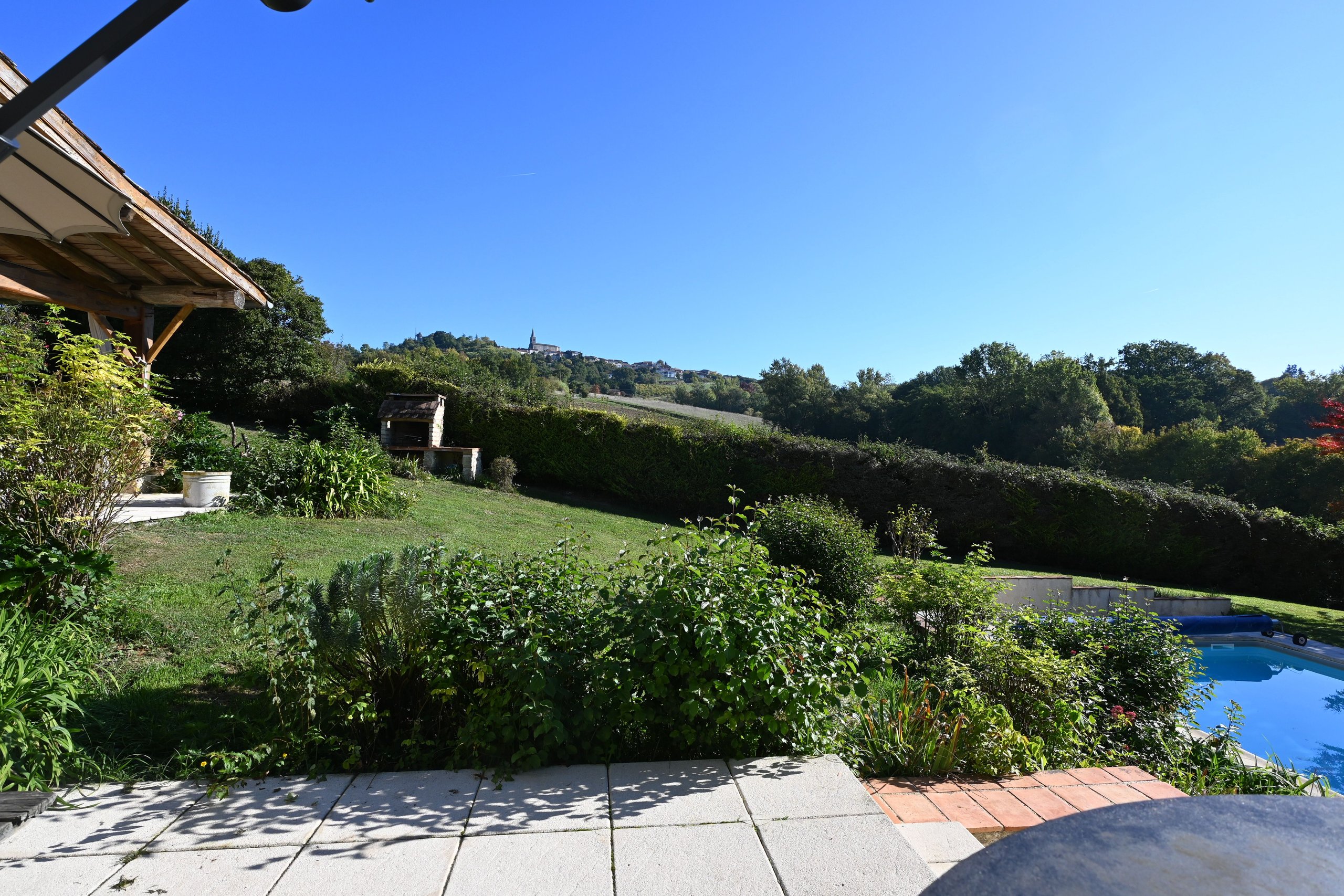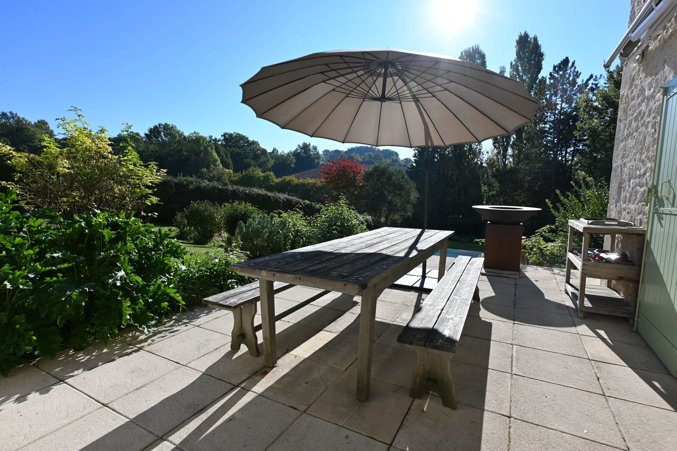 Buiten is er een prachtig terras naast de keuken, en in het bijgebouw een aangenaam overdekt terras en een studio met een mezzanine. Het zwembad ligt iets lager en sluit naadloos aan op de tuin. In een kelder bevinden zich de warmtepomp, de technische ruimte van het zwembad en een kleine wijnkelder.