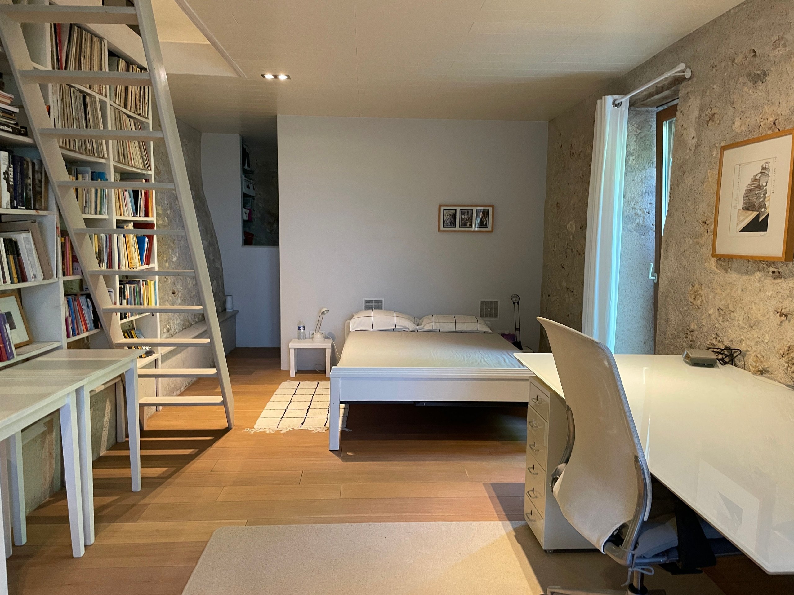 Two bedrooms and a bathroom. On the garden level, there is a guest bedroom with a shower room.