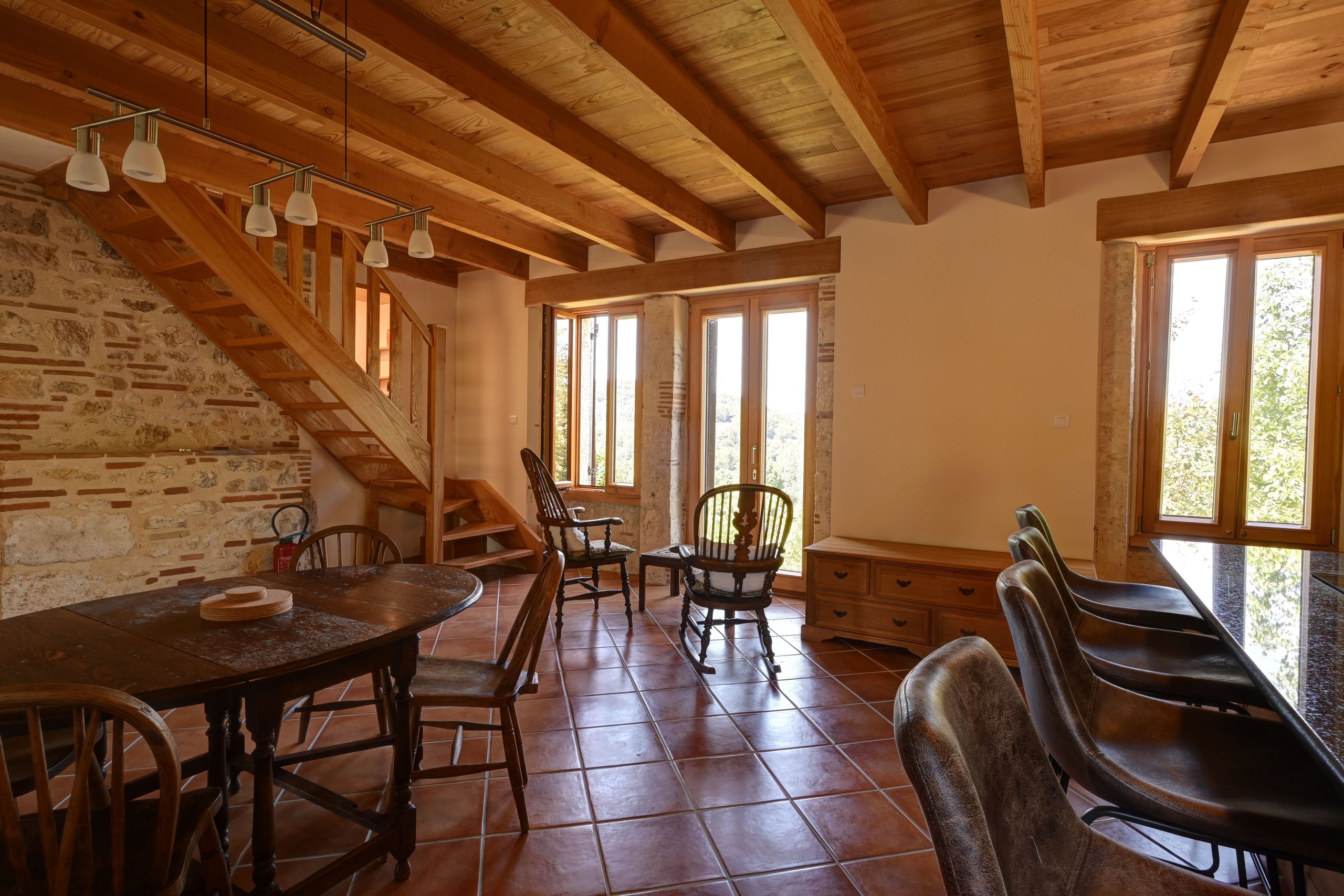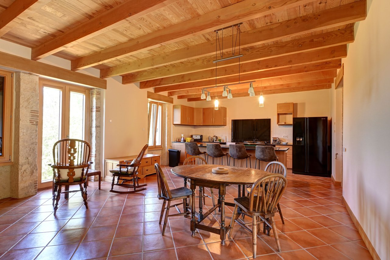 The second house is located a little further down and retains all the charm of the old with its stone walls and exposed beams. It also features a beautiful terrace at the entrance, a fully equipped kitchen, granite countertops, a wood-burning stove, electric heating, and double-glazed windows. A living room, dining room, and bathroom here and upstairs there are three bedrooms and two bathrooms. downstairs a fourth bedroom.