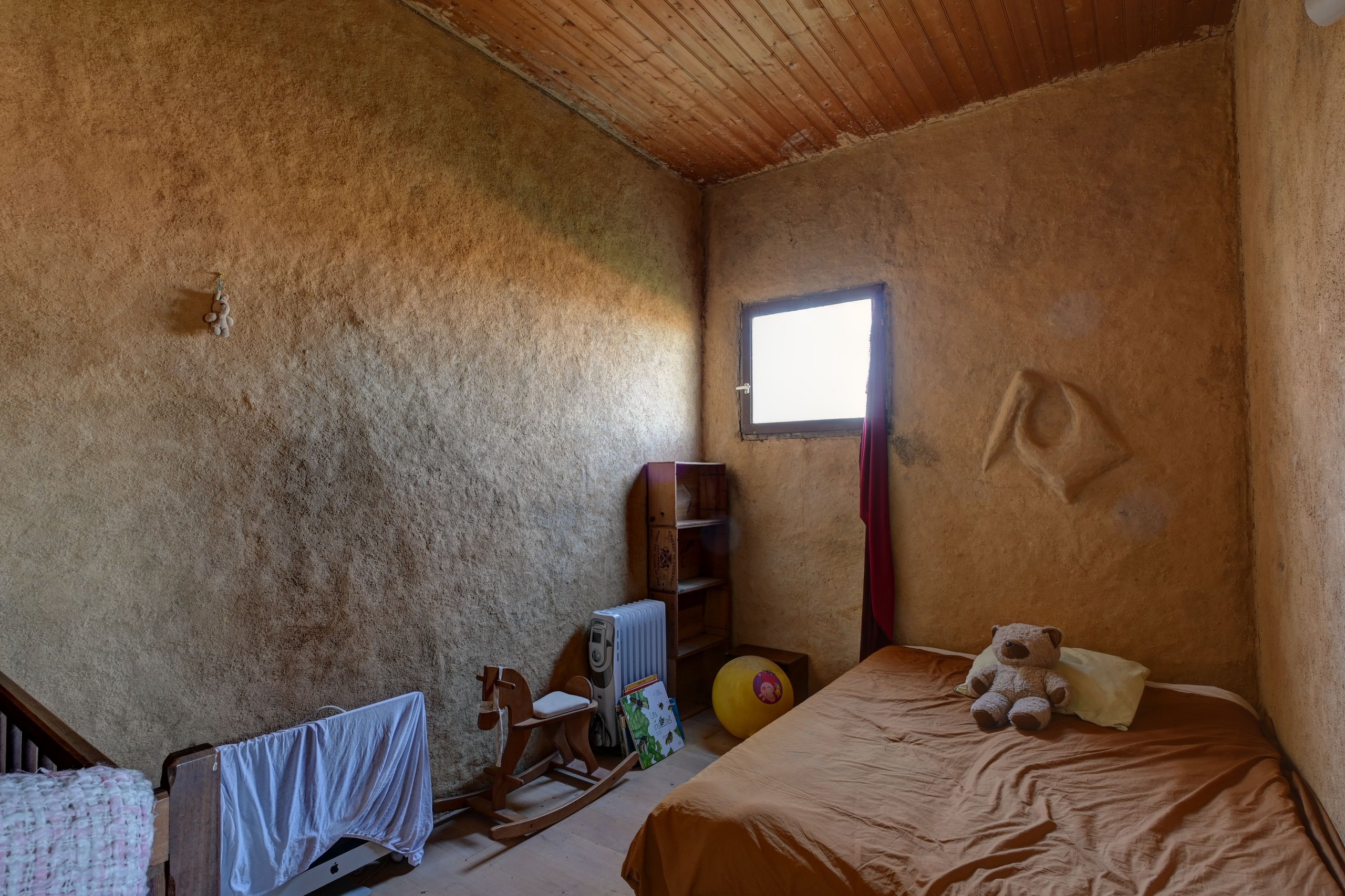 De woning is bereikbaar via een lange privé oprijlaan, omgeven door bossen en biologische landbouw. Het huis beschikt op de begane grond over een veranda op het zuiden, een grote woon-/eetkamer met een open keuken, twee slaapkamers, een kantoor en een bijkeuken met toegang tot bijgebouwen/werkplaatsen van meer dan 100 m², een carport voor opslag en een garage. Boven zijn er twee slaapkamers op zolder.